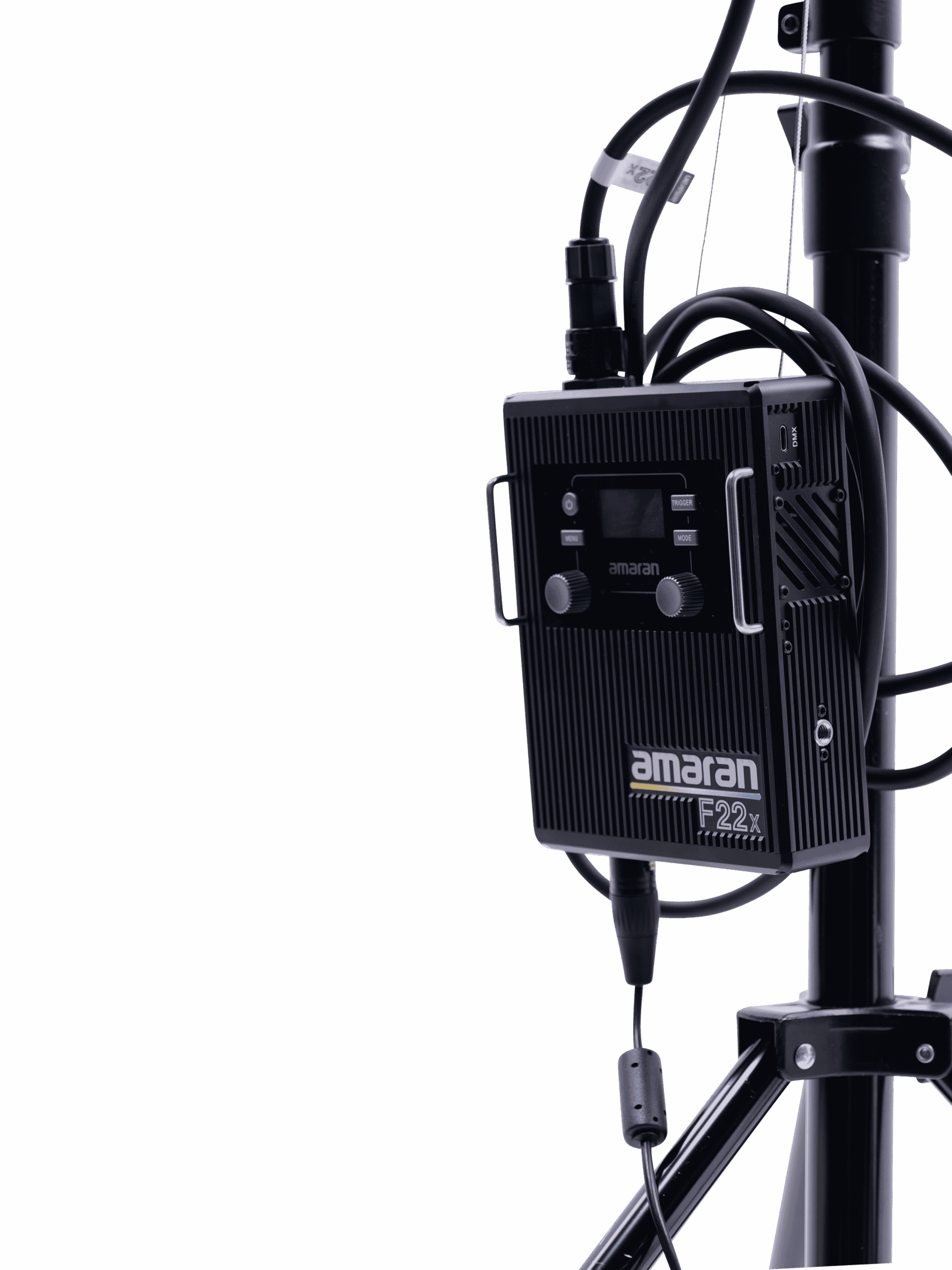Building the F22x is quick and convenient with the compact, folding X-Frame that stretches out the F22x into a rigid panel. This frame can be attached directly to a C- Stand grip head using the Straight Baby Pin adapter, or onto any standard light stand with the included Right Angle Baby Pin and tilting stand mount, providing an ideal option for all types of filmmakers and creators. Attach the included softbox, one of two strengths of diffusion, and the fabric grid using the integrated hook-and-loop fabric to further finesse your lighting design and add a beautifully controlled soft light to your scene. You can also swap out the softbox for an amaran F22 lantern modifier*, allowing you to replicate a volumetric lantern or pancake light with an ultra-light full-colour fixture. With an integrated 3-meter long head cable and the included 3-meter long extension, the F22x can reach out 6 meters away from its compact control box. Engineered from the ground up for the perfect balance of size, weight, and intensity, the F22x’s LED and heat dissipation design results in a heavy-weight punch from a flexible feather-weight design. Each control box is also outfitted with a multi voltage battery plate so you can use a capable 14.4V battery to achieve half power, or max out the intensity with full power when using compatible 26V or 28.8V batteries. You can also achieve full output when using the AC power supply, each of which comes with a specially designed battery plate bracket for a seamless user experience. And when combined with the soft carrying case, the F22x becomes a portable light that you can take anywhere for any production.