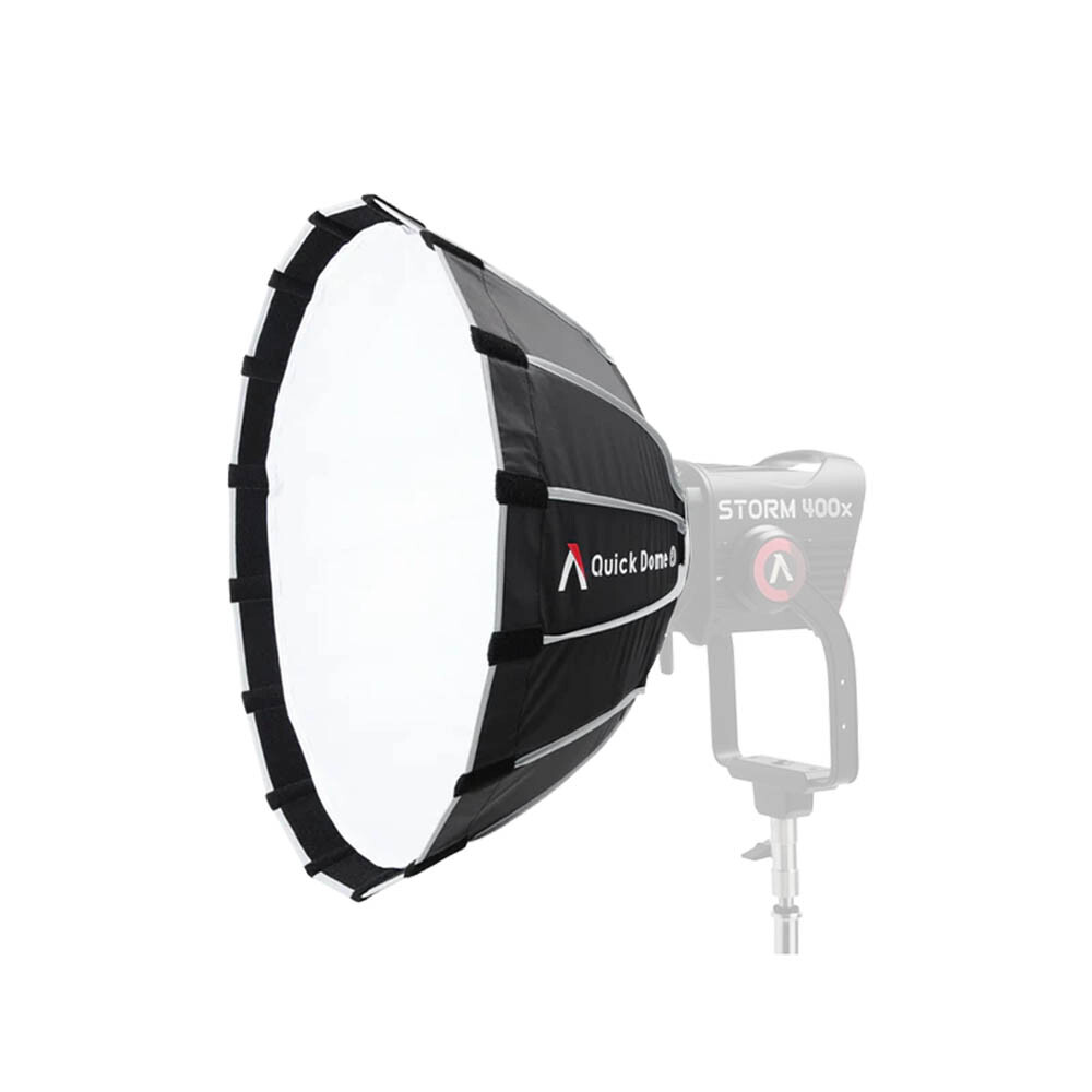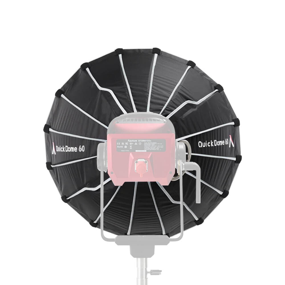 Aputure Quick Dome 60 (6977162455792) is a 60cm (2ft) circular Bowens mount softbox built for fast, reliable light shaping on set. Its quick release latch mechanism allows users to tension the steel support rods on the speed ring within seconds, streamlining both setup and teardown. The extended lateral side handle makes mounting and unmounting easy and controllable, and Quick Dome 60 packs flat for storage and transport. Includes 1-stop diffusion, inner baffle, and 40° light control grid.