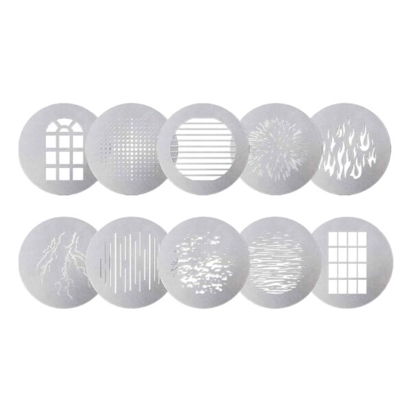 The 10-Piece Gobo Kit (A-Size) comes with 10 different gobo designs of various shapes and images, enhancing the creative control users have when it comes to projection lighting design options. These 10 gobos include classic designs like Modern Window, Fire, Scatter, Church Window, Grille, Ripple, Lightning, Linear, Fireworks, and Dot.