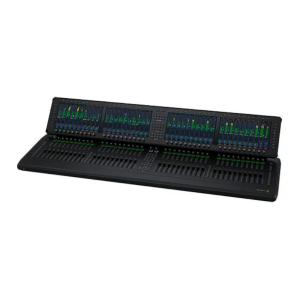 Desktop panel with 40 motorized faders, four large touchscreen displays, controls for layers, bus, matrix, aux, VCA, sub-masters, talkback and more. Fully integrated with Fairlight Live.