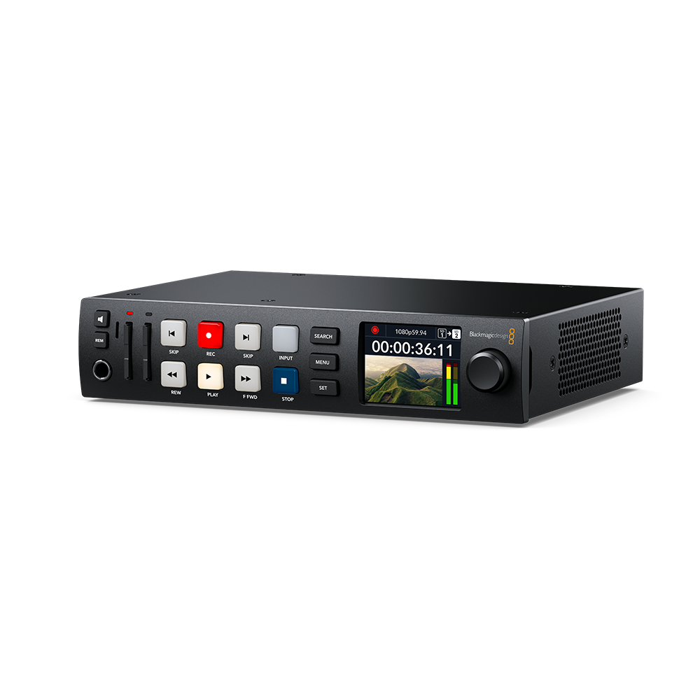Blackmagic HyperDeck Studio HD Plus (HYPERD/ST/DCHP) includes all the features of the Mini model, but is larger so it has more space for extra controls and extra connections. This model adds 6GSDI so it can record and playback ProRes up to Ultra HD 30fps, and it includes an SDI loop out and HDR support. Plus the two 6G-SDI outputs allow fill and key playback up to 1080p60. There is also an HDMI input and a dedicated 3G-SDI monitoring output with overlays. Any button pushed on the front panel is sent to a dedicated RS-422 remote output and the DC power is now a broadcast style XLR connector. The front panel is also upgraded with better transport control buttons, a headphone socket, and a built-in speaker.