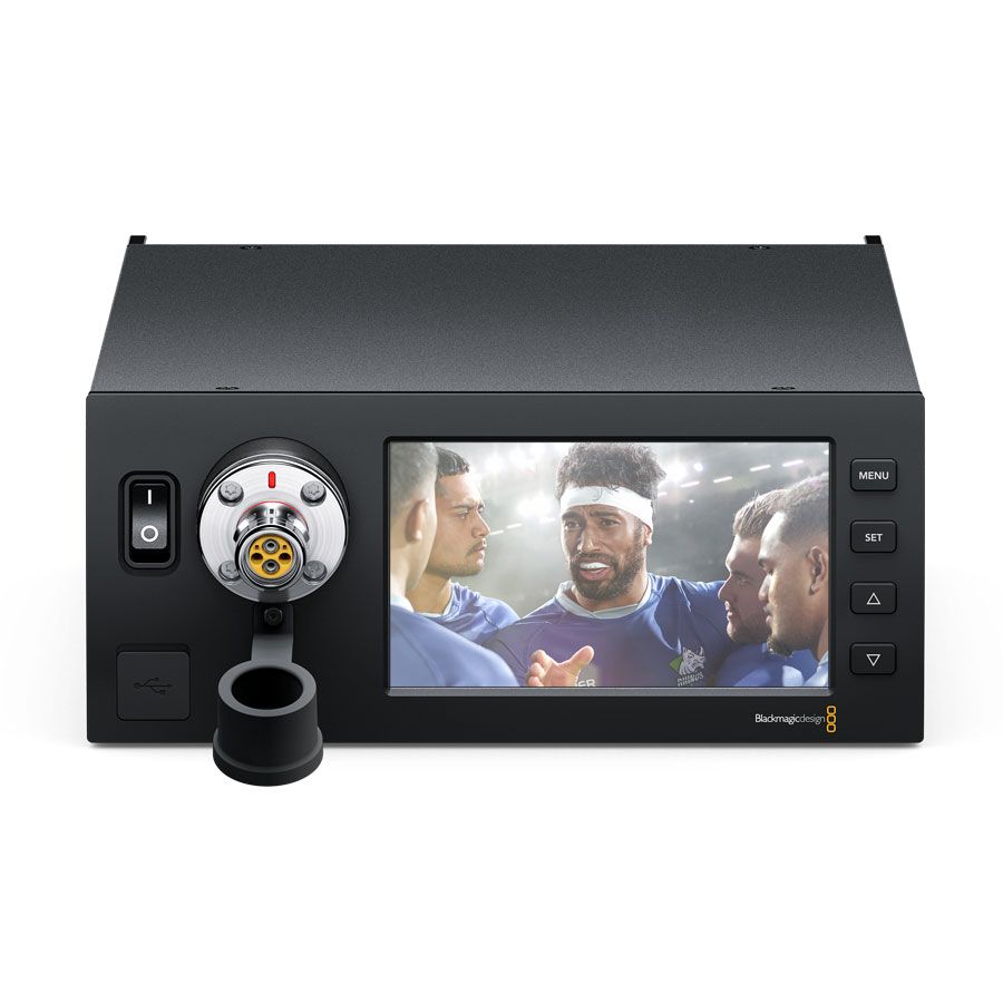 The studio fiber converter includes connections for tally, two dual-channel intercoms for industry standard 3rd party talkback systems, and even a backup engineering talkback channel in case the fiber goes down. You get a main Ultra HD camera feed plus 3 independent HD return feeds with full remote camera control, PTZ, tracker talkback, and ethernet, all through a single SMPTE fiber cable. Plus, there is a large 5 inch LCD screen right next to the SMPTE fiber connection on the front panel for monitoring signals from the remote camera. This allows for easy patching and verification of the remote camera function.