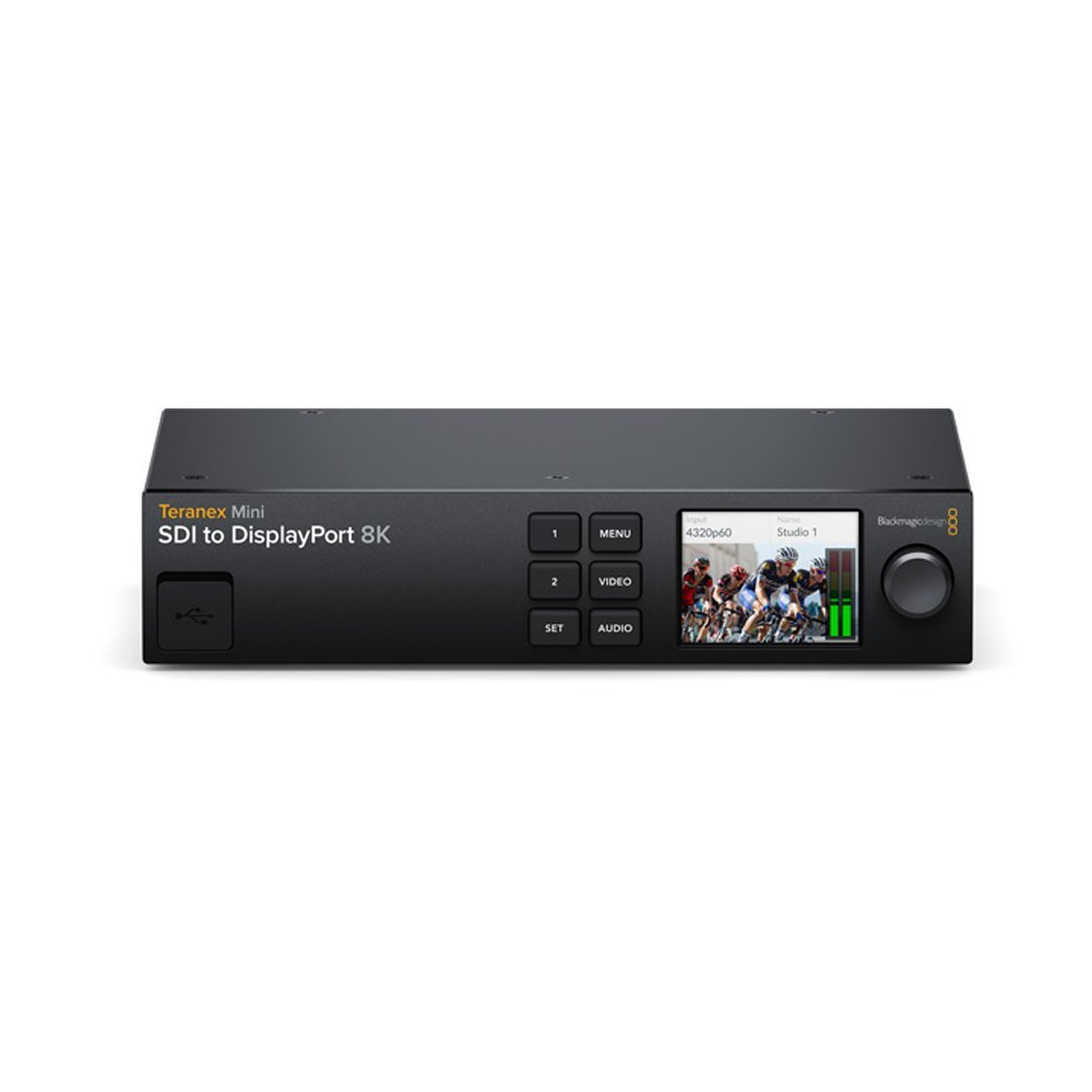 Blackmagic Teranex Mini SDI to DisplayPort 8K HDR Converter (BMD-CONVN8TRM/AA/SDIDP) provides an advanced 8K monitoring solution. Its DisplayPort outputs enable you use pro monitors like the Apple Pro Display XDR as part of your on-set or post-production monitor setup. The four 12G-SDI inputs support 4K signals independently or an 8K input signal together, either DCI 8K or 8K video split into four UHD signals. It can use third-party calibration probes such as the SpectraCal C6, X-Rite i1 Display Pro, or the Klein K10-A probe to accurately align connected displays for precise color. The built-in, color LCD screen displays not only the video image, but it can also display two on-screen scopes selected from WFM, Parade, Vector, and Histogram options.