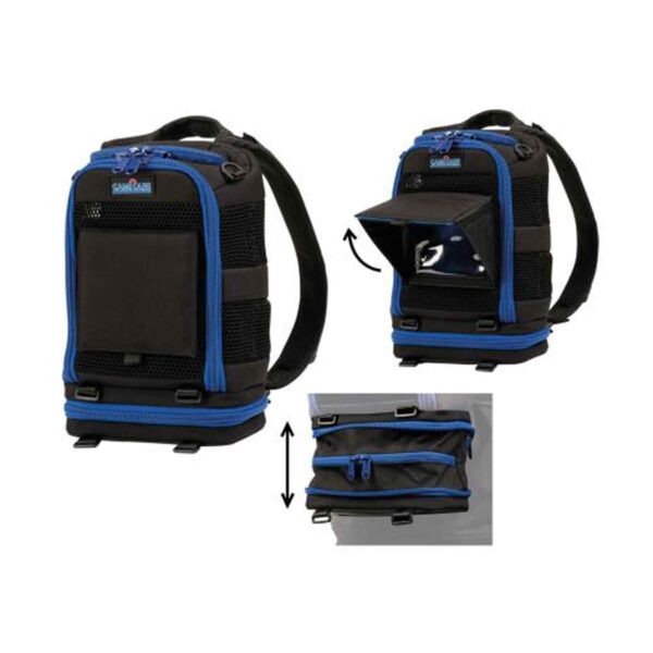 On the bottom of the bag a special compartment – which is extendable up to 10 cm – is added for a battery and/or cables and accessories. In a closed off compartment with zipper you’ll find the built-in rain cover and sun reflecting cover.