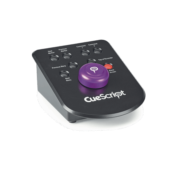 CueScript’s desktop control device adjusts the speed and direction of scrolling text on the prompter, featuring quick command buttons that allow navigation around the script and trigger configurable commands.