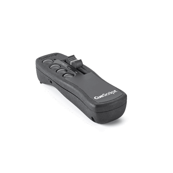 CueScript’s wireless hand control is a hand-held device designed to be used by the presenter/speaker to adjust the speed and direction of scrolling text on the prompter.