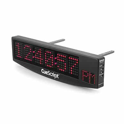 CueScript CSTD – Time Display (CSTD). An alphanumeric tally digital time code display that mounts to the CueScript CSM and CSMV2 prompter range. The CueScript Time Display also doubles as a cue light, taking the camera tally signal via CueScript’s photoelectric cell sensor or the wired camera tally. This changes the numbers from green to red when live/on air.