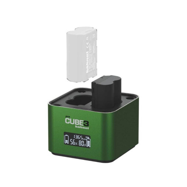 Hahnel ProCube 3 For Fuji (1000 577.3) charges 1 or 2 camera batteries at the same time. The LCD display shows battery charge status while charging and the mAh reading indicates the capacity added during charging.