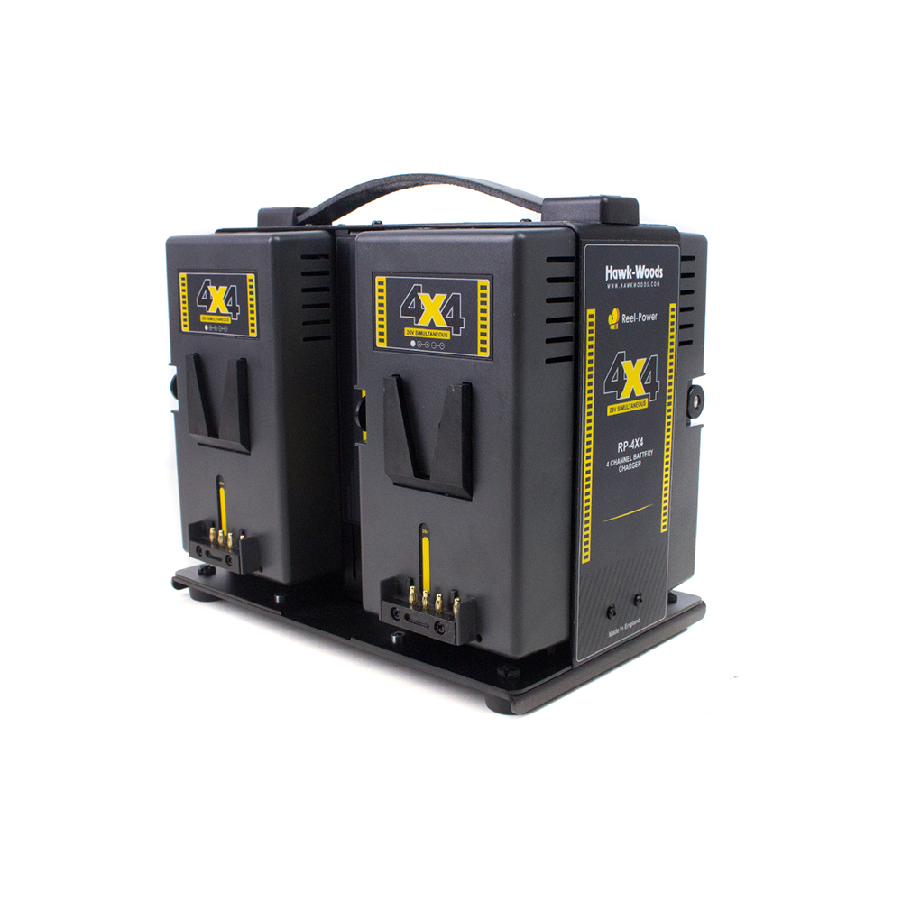 Hawk-Woods RP-4X4 Simultaneous Fast Charger (RP-4X4) is for Hawk-woods Reel Power batteries. This 2.5Ah charger will charge up to four of these high-speed camera batteries within four hours.