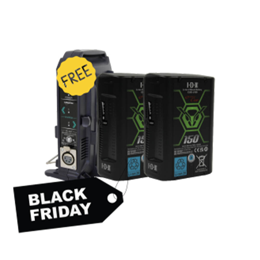 IDX 2x CUE-J150 With FREE VL-2X Charger has a 143Wh capacity and is capable of handling high current loads up to 12A/156W. Each CUE-J series battery has a single built-in D-Tap output capable of taking an 80W load and a 4-LED power indicator. The CUE-J Series battery products are designed to be an affordable, reliable option for a variety of power needs such as powering cameras, portable production monitors, portable lighting and audio products that require power from a V-Mount plate or D-Tap to XLR cable input.