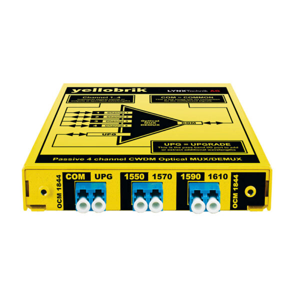 The Lynx Technik Yellobrik OCM 1844/4 Channel CWDM Optical Mux/Demux (OCM-1844) is a compact CWDM passive 4 channel optical multiplexers/demultiplexers designed to send and receive up to 4 individual signals over a single fiber link. Each module has an UPG (Upgrade) port to cascade into the other 4 channel modules, expanding the capability of the system to a maximum of 16 channels.