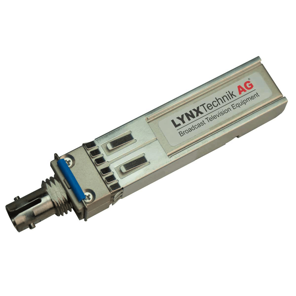 The OH-TX-12G-ST single channel optical transmitter is an integrated plug in option for selected LYNX Technik products. This SFP module facilitates the conversion of SDI electrical signals at ST-2082-1 (12G), ST-2081-1 (6G), ST-424 (3G) and ST-292 (HD) to optical signal. The OH-TX-12G-ST module is a pluggable SFP with ST connector for use in LYNX products which provide an SFP slot. This module is paired with OH-RX-12G-ST single channel optical receiver module to transmit singnals up to a maximum distance of 10km** over a single mode fiber. A socket, or a “cage” is provided for the SFP in the supporting LYNX product for easy installation or upgrade. This SFP is hot swappable.