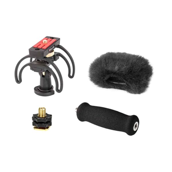 A combined Windshield and Suspension solution, the kit contains everything needed to protect a handheld digital recorder from outdoor wind noise, and also to isolate it from unwanted vibrations, whether from handling or stand-borne noise. It is aimed at journalists, film-makers, or anyone using a handheld digital recorder to make professional-quality audio recordings outdoors. It can be used location soundtracks or outside broadcast, or for simple audio podcasts or outdoor radio reporting.