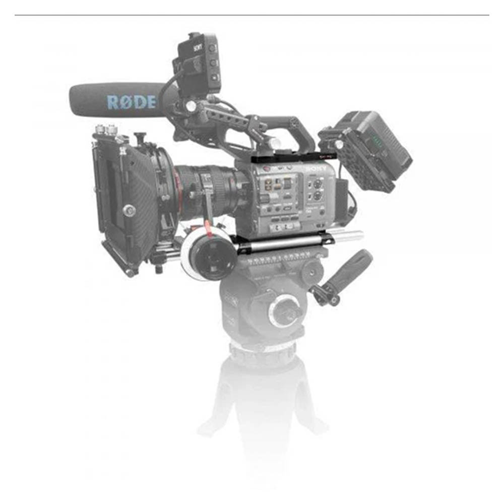 The lightweight baseplate with a 15 mm rod system is designed to match the SONY FX6 optical center. It features two attachment points (1/4-20 and 3/8-16) to mount the Sony FX6 body securely. The baseplate also comes with a pair of 15 mm rods that are 12” long through the length of the baseplate