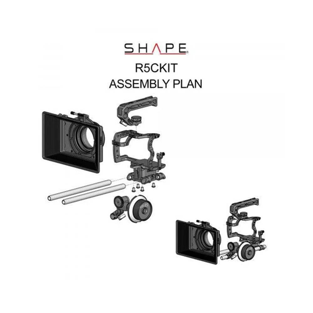 Shape Camera Bundle Rig Kit for Canon R5C/R5/R6 (R5CKIT) is custom-made for Canon R5C, R5, and R6 cameras. It has multiple threaded holes, allows easy access to camera features, accommodates strap hooks, and includes a detachable lock system for HDMI cables. The SHAPE Lightweight Single Tray Matte Box features a silicone matte box for wide-angle lenses, with a single filter tray system and optional enhancements like a swing-away mechanism.