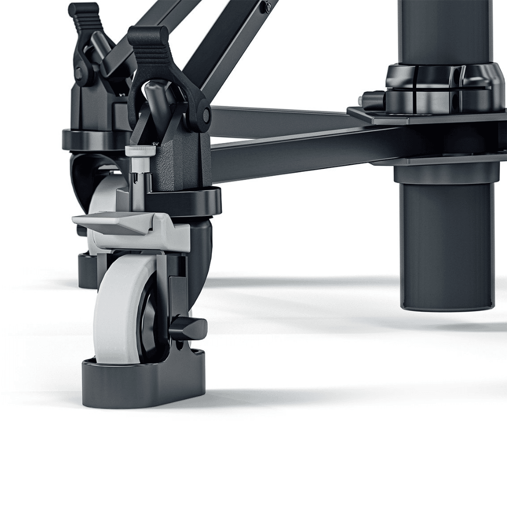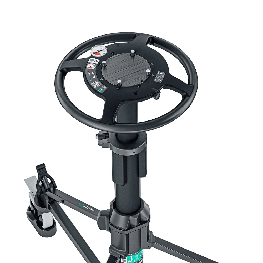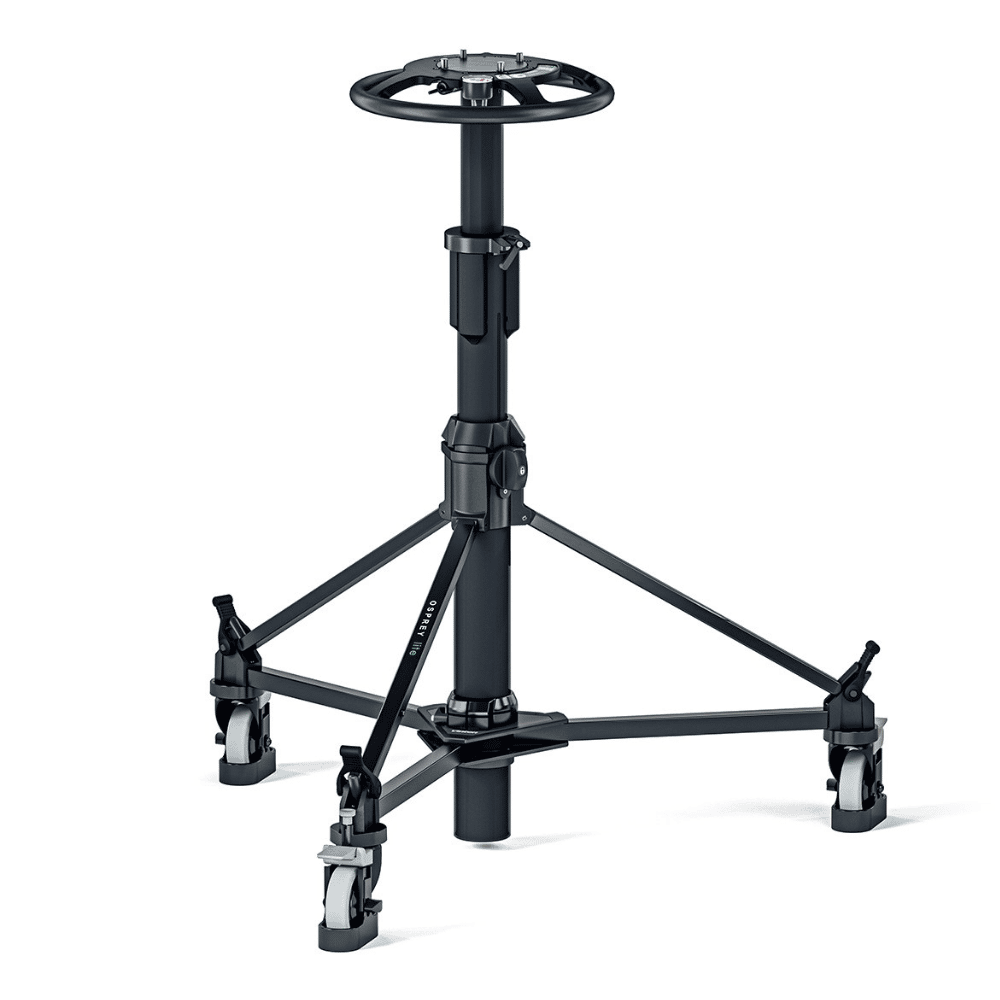 Vinten Osprey Lite Pedestal (V4169-0001). The Osprey lite is a lightweight, compact pedestal. It has 2 stages for acheiving very high and low shots, and the upper stage is perfectly balanced for on shot tracking of talent. It has an integral manual pump and an inlet valve for use with an external supply, making Perfect Balance easy to achieve. In addition, the Osprey lite pedestal includes a pressure gauge for clear and reliable set-up and the detachable skid allows the pedestal to be simply broken down into two sections for easy storage and transportation. The Osprey Lite pedestal comes with track locks and adjustable cable guards for studio use.