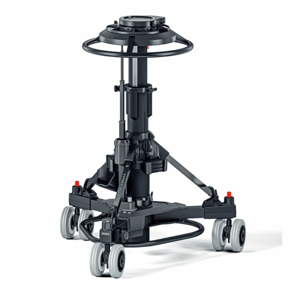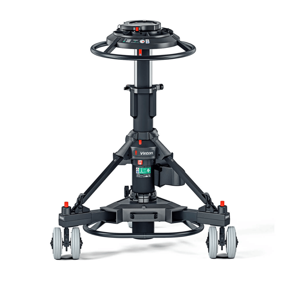 Vinten Osprey Plus S Pedestal (OB) (V4171-0002). The Osprey Plus S (OB) is a fully steerable version of the Osprey Plus and is capable of payloads up to 70kg / 155lb. It has 2 stages for acheiving very high and low shots, and the upper stage is perfectly balanced for on shot tracking of talent. It has an integral manual pump and an inlet valve for use with an external supply, making Perfect Balance easy to achieve. There is a storage area for the camera operator. In addition, the Osprey Plus pedestal includes a pressure gauge for clear and reliable set-up and the detachable skid allows the pedestal to be simply broken down into two sections for easy storage and transportation. It has a selector for both single wheel and all wheel crab steering for working in tight spaces and on shot direction changes. It comes with 16cm / 6.3 inch wheels for greater ground clearance in outside broadcast applications.