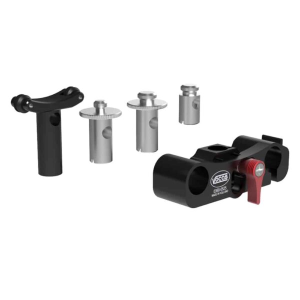 15 mm universal lens support which is horizontally and height adjustable. It includes a 1/4″ and 3/8″ lens connection and a V shaped bracket to support any lens without a 1/4″ or 3/8″ connection properly. A small extender is also included in the package to lift up the 1/4”, 3/8” and V-shaped bracket support even higher. The flexibility in height and the horizontally adjustment, together with all the different support bracket, ensures compatibility with almost every cinema and photolens.