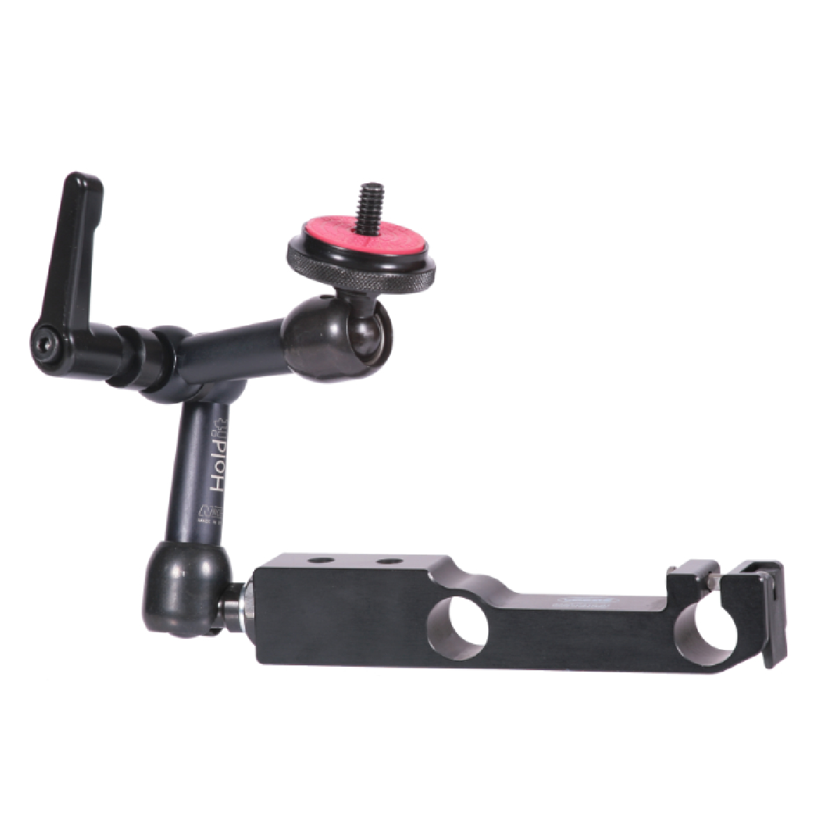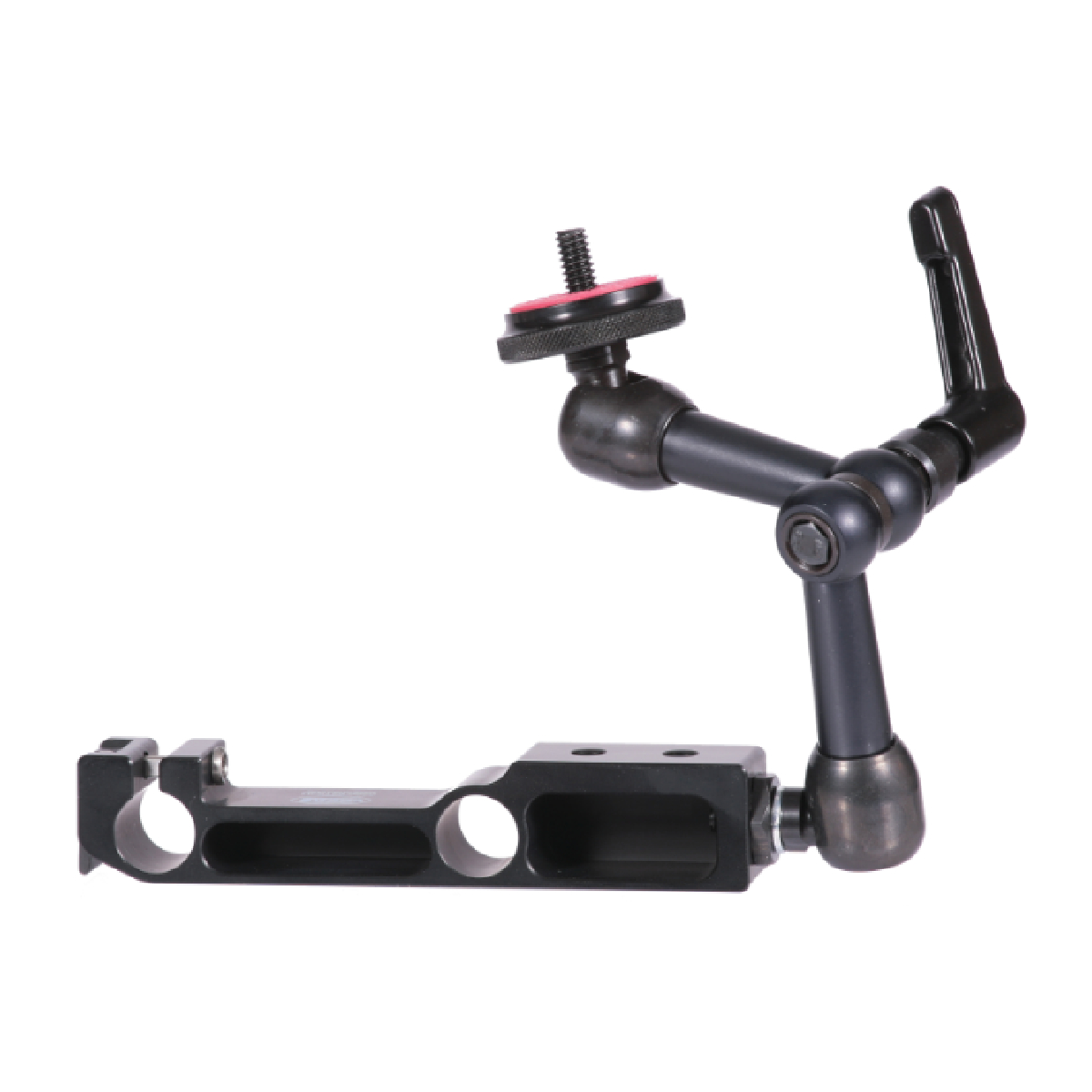 15 mm Monitor support short (4,2” long). The monitor support can be attached directly to a 15 mm LWS rail support and has a maximum load of 3 kg. To the 15 mm rail support, a Noga magic arm is mounted with a 1/4” thread, to mount to monitors, viewfinders and recorders.