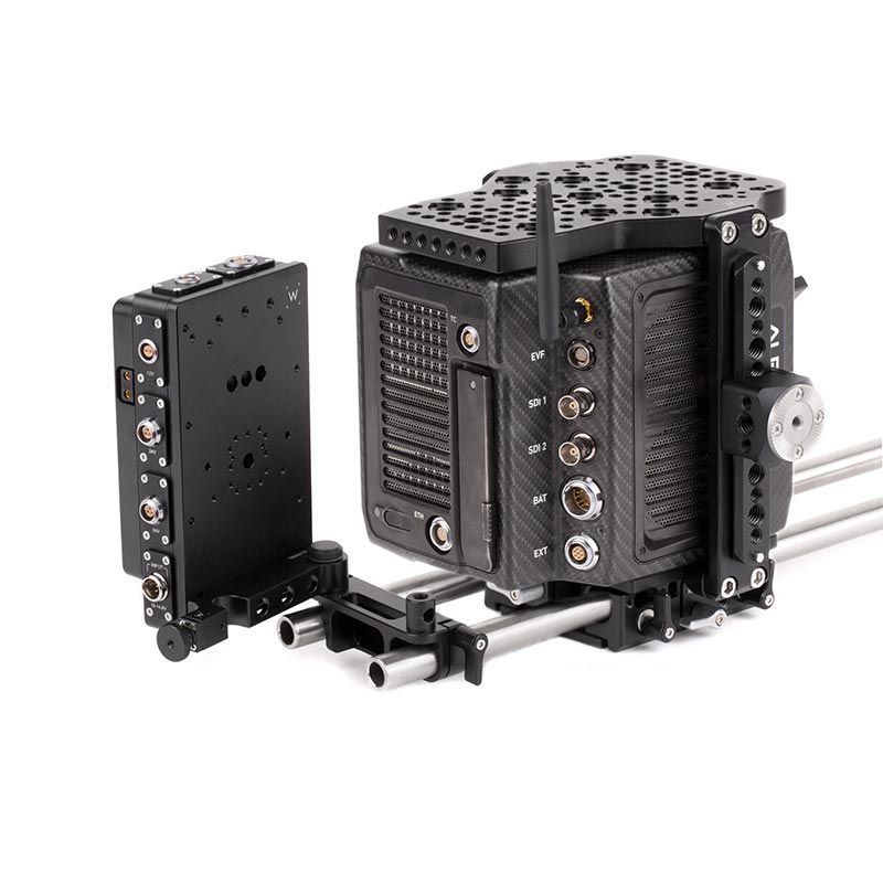 Provides standard V-Mount and Gold Mount hole patterns for mounting WC battery plates and the D-Box (Alexa Mini) Quickly access the back of the camera by pulling the black pin and swinging open Mounting bracket has integrated 15mm rod openings and is most commonly used in the lower position for bottom rods Battery Swing can be mounted to top rods by moving the swing arm to the top row of holes on the battery bracket