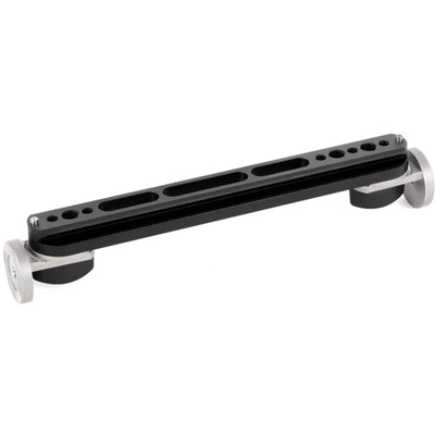 Wooden Camera Crossbar v3 (Pivoting ARRI Rosettes) (270900) consists of a NATO rail on top with safety pins on each end, 1/4-20 and 3/8-16 holes for attaching accessories.