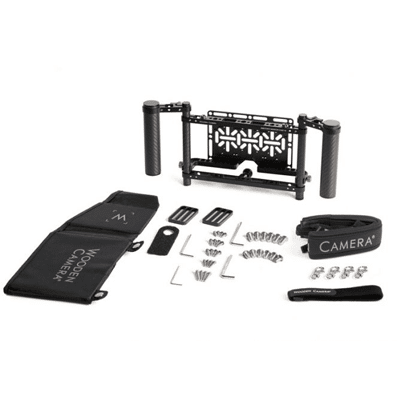 The included sun shade is adaptable to most monitors and snaps directly to the cage frame. The bottom of the shade is made of velcro, which can be adjusted to the proper width of the monitor and an included loop piece can be used to hook onto the bottom of the cage for a more permanent mounting of the shade. The tool-less design of the handles allow them to be folded in for easy packing and the sun shade can be repurposed to act as a protective cover. Also included is a padded neck strap with 4 mounting points, a Teradek mounting bracket that offers easy attachment for wireless receivers with lower #4-40 or 1/4-20 mounting points, and a cable tie for cable management.