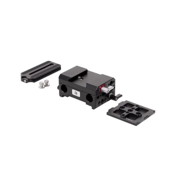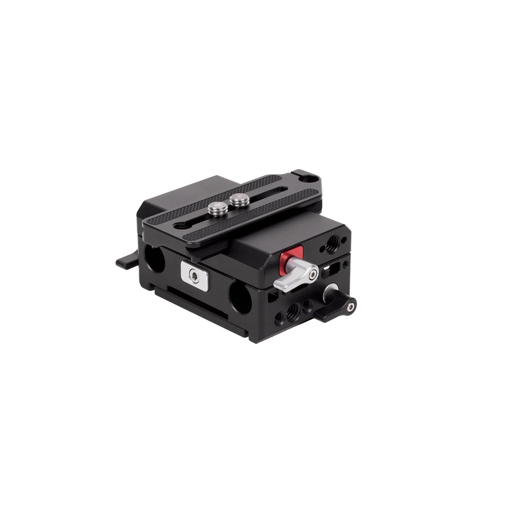 [vc_row][vc_column][vc_column_text]Quick release baseplate that provides lightweight 15mm rod support at the correct lens height. 15mm rods pass through front to back and have two locking thumb screws per side. The baseplate quick releases in two ways, giving the user the option to take the 15mm lightweight rods or to leave them behind.