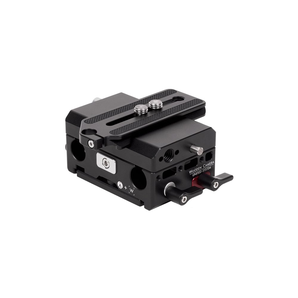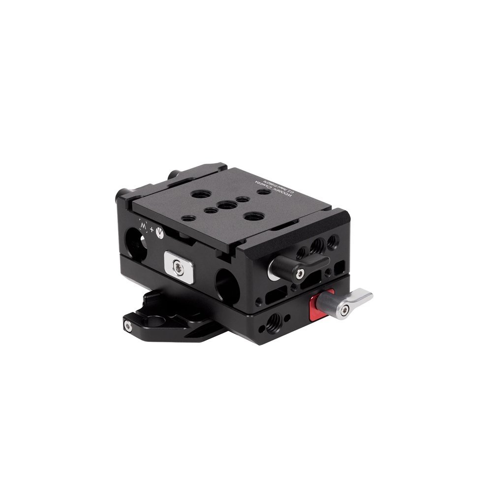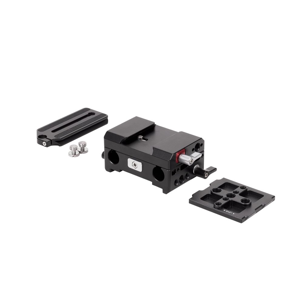 Baseplate features an upper ARCA Swiss standard dovetail with 3/8”-16 screw for attaching to the bottom of the camera. Upper ARCA Swiss standard dovetail slides into the LW 15mm Baseplate core, and includes a safety release button for removal. Also features a vertical lens support post system.