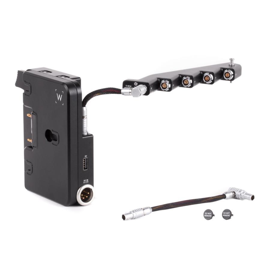 Wooden Camera D-Box for Sony Venice Cameras – Gold Mount (p/n 258100). D-Box (Sony Venice, Gold Mount) is a custom version of our popular D-Box that adds power distribution, standardised remote start/stop, and hot swap abilities for the Sony Venice camera. The D-Box main unit attaches to the back of the AXS-R7 or to the V-Mount plate on the camera rear and the Power Strip portion attaches to the top right side of the camera via a 3pin Fischer and the tape hook threaded hole.